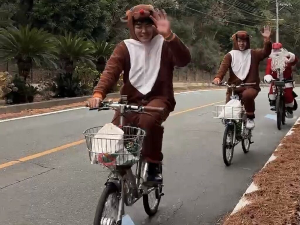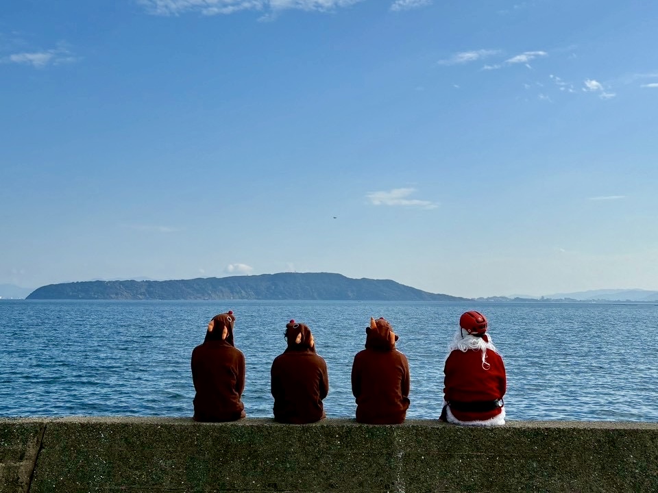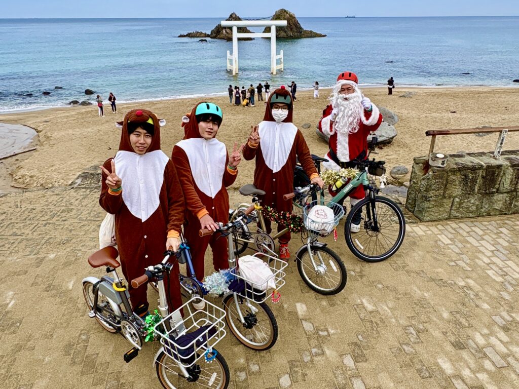 九州大学の学生ボランティア3名が“トナカイ”として参加し、サンタクロースとともに自転車で糸島を走りました。