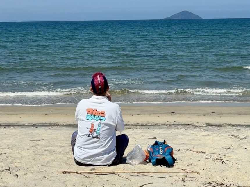 豆乳パンとチーズ×ハチミツは、海で食べると格別。